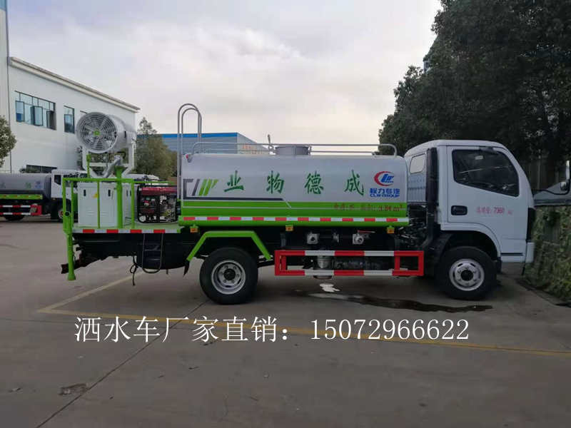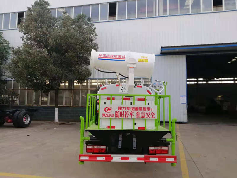 這臺5方綠化噴灑車采用錫柴110馬力發動機,5檔變速箱,700R16鋼絲胎,罐體容積5方,前沖,后灑,側噴,綠化水炮,后置一個霧炮,噴霧距離可達30米。罐體上按客戶要求噴涂了“成德物業”四個字。